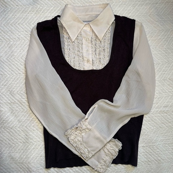 🖤 Details: This top is giving autumn and dark academia vibes. It has a silky cream long sleeve “under” shirt and a chocolate brown sweater vest over top. Perfect for those moody fall outfits
