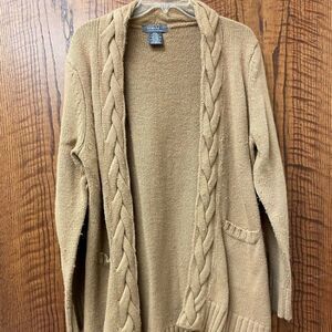 Like new George Designs by Mark Eisen academia professor teacher cashmere open front black and camel cardigan 2 pack. EUC, great shape, size XL, lambs wool, Angora, cashmere blend, front pockets, braided collar, see pictures for details.