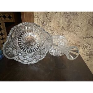 Both pieces are still in great condition and are a clear glass, not white. Ice bucket measures 6.5" wide and 6" tall. Vase measures 9" tall and 4.5" wide. Both pieces are super heavy and stunning.