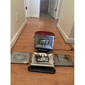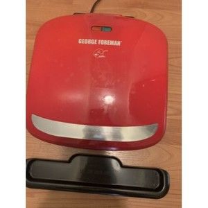 George Foreman Grill Red GRP360R 4 Servings Removable Plate Grill Panini Press in good/fair condition. There are scratches, scrapes, and spots/staining on the grill in places all over. The removable plates are scraped all over and underneath the removable plates on the grill is lots of stains. The grill works pretty good. See images carefully!