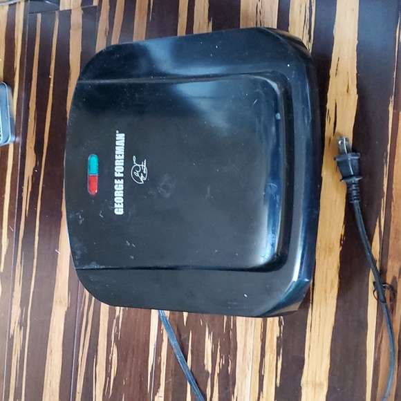 Black George Foreman grill. Works great. Comes with a drip tray.