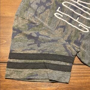 This George short sleeve tee features a unique mottled appearance in shades of green and blue, creating a stylish and casual look. The shirt is designed with a classic crew neck and has large white text across the chest that reads 'GEORGE FOX'. Perfect for everyday wear, this tee combines comfort with a trendy aesthetic.