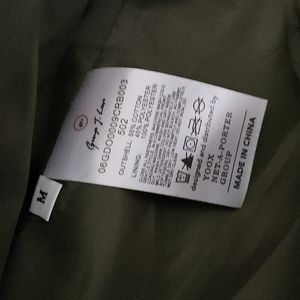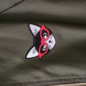 Olive green zip-up bomber jacket with whimsical kitty patch on front. Cropped fit with metal zipper and pockets on seam. Fabric is 55% cotton/45% polyester with 100% polyester lining. Size medium but runs small. Ruffle detail on dropped shoulder area. Cute jacket that was barely worn. Excellent condition.