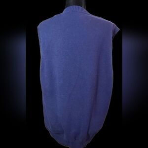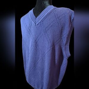 Beautiful sweater vest - an essential component in a well-dressed gentleman's wardrobe. Much darker navy blue than shows in pics (some pics look purple). This oversized pullover has a vee neck with ribbed trim, as do the sleeve openings. The diamond print detail is a nice pattern reminiscent of a monochrome argyle. This sweater can be dressy or casual, depending on how you pair it. Nice with slacks and a tweed sports jacket, equally nice with faded jeans and a denim chambray shirt. You can wear it for travel, on vacation, to a party -- it'll fit in anywhere!