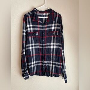 Stylish plaid shirt with button-down front. Features navy and red pattern. Perfect for casual wear.