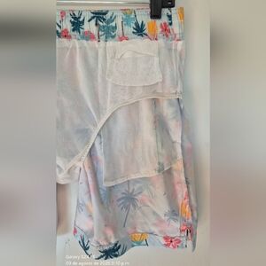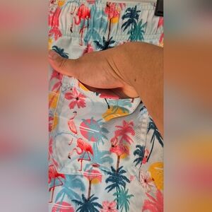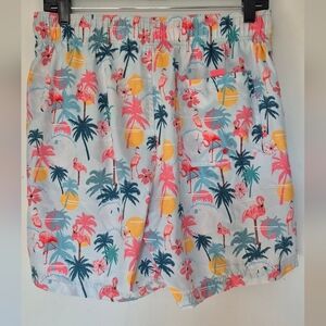 Shorts for men tropical print shorts. Features flamingos and palm trees. Elastic waistband with drawstring. Perfect for casual wear.