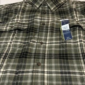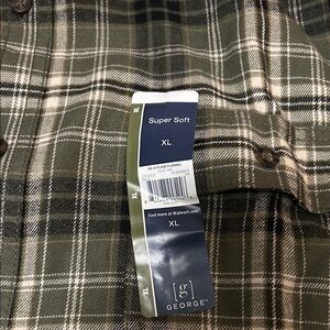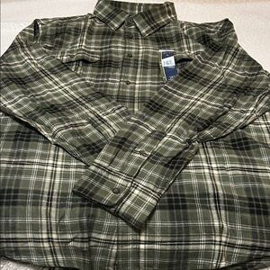 Casual olive plaid flannel shirt with button-down design. Features chest pockets and classic collar. Ideal for relaxed outings. New with tag
