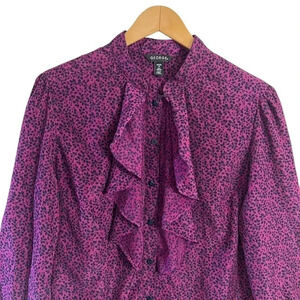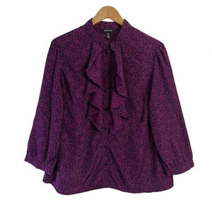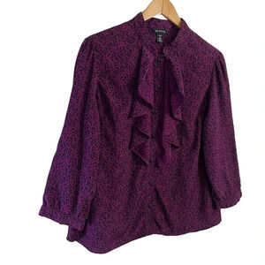 George Purple Blouse XXL Floral Vines Pattern Ruffled Long Sleeves Button Up Top