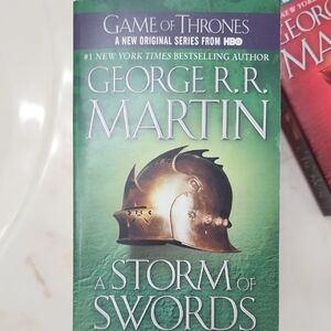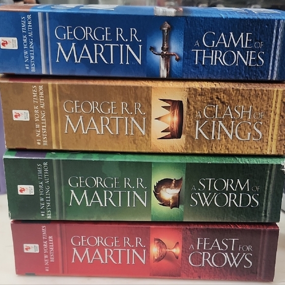 Set of four books by George R.R. Martin. Includes 'A Game of Thrones,' 'A Clash of Kings,' 'A Storm of Swords,' and 'A Feast for Crows.'