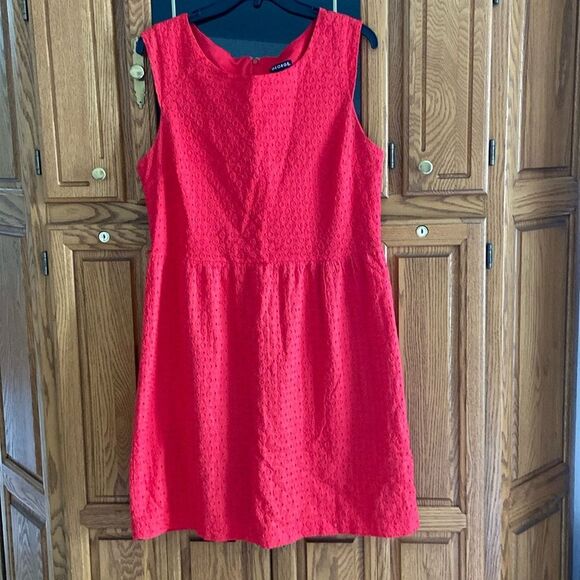 George Rock and Red Eyelet Cap Sleeve Fit and Flare Knee Length Casual Feminine Dress. Size: 14. Excellent used condition. Lined. Invisible back zipper. This dress has 2 belt loops but no belt.