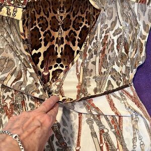 George Simonton szL brown print top buttons & bling at shoulder wrap front EUC