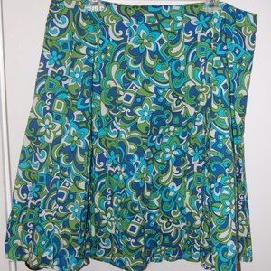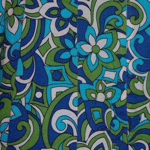 White, blues, green, and black. 100% cotton. Machine wash cold, tumble dry low. EUC. Cat friendly home.