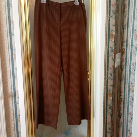 Size 8, brown with white pinstripes, 66% polyester, 30% Rayon, 4% spandex.