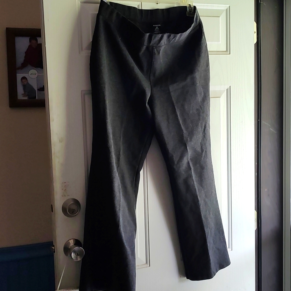 charcoal slacks with full elastic waist, no pockets by George. 1x,16w. Very warm for winter, made of polyester rayon and spandex.waist 17-21, inseam 27.5