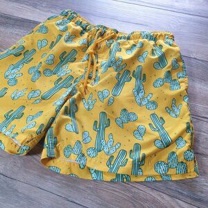 George Swim Trunks Yellow Cactus Print Shorts Elastic Drawstring L 36-38 Pool