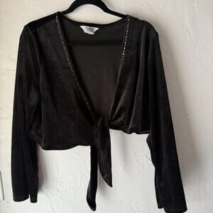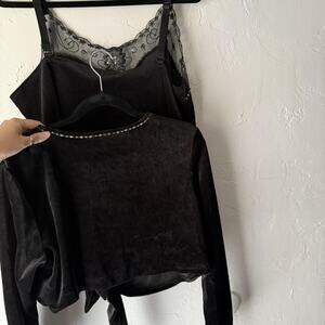 2 piece set includes a sleeveless velvet tank top with mesh and beaded detail, and a long sleeve velvet tie-front cardigan with matching sequin/bead trim