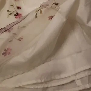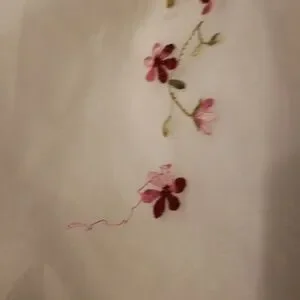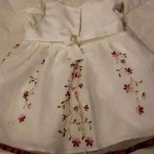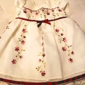 Prett George dress. It has four layers. Lining, tulle. Another lining the sheer embroidered organza. The top is satin like polyester. 3 buttons up the back. The maroon ribbon makes the hem. The flowers are maroon and pink on green vines.