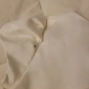 There is a loose thread on a lower flower and a tiny ink mark at the back of a sleeve next to the seam.