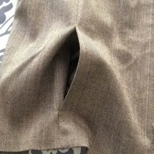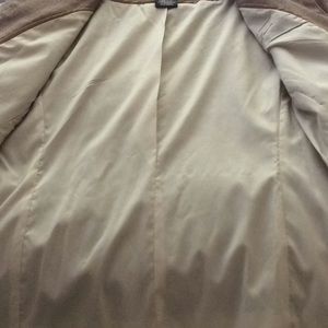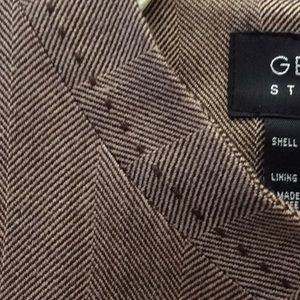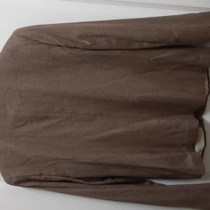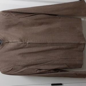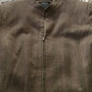 Jacket is a brown tweed. It is a vintage jacket. In great condition. Fully lined, zip up front, 2 slit pockets, and tailored seams in front and back for fitted look. It has never been worn. It has a stand up collar with cute stitches in a darker brown than coat. Chest is 21”. Back is 24 & 1/2”. Great condition. Smoke free home.