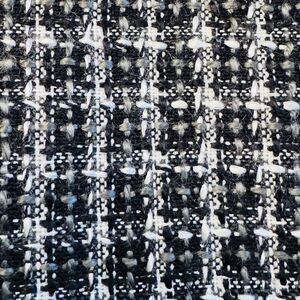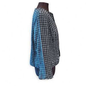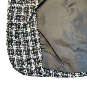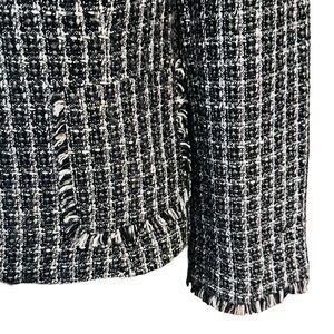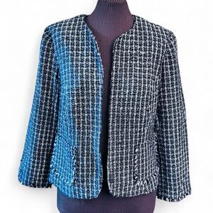 This classic open front blazer will be a nice addition to any cool season capsule wardrobe. The textured boucle fabric in versatile black and white will pair well with a skirt, pants, or dress, or even jeans for a dressed down look. Details include fringe split sleeve ends and fringed edge front pockets. Collarless design and darts for a bit of shaping. Fully lined. In gently used clean condition. Ships from smoke and pet free home.