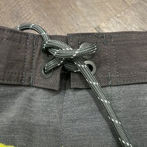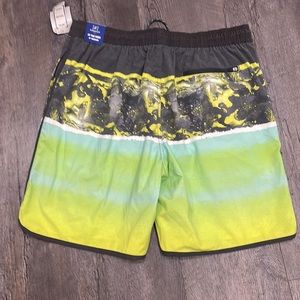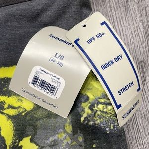 Brand new. Back zippered pocket and front side pockets. Drawstring front. Size large fits 36-38 gray green yellow