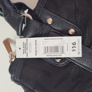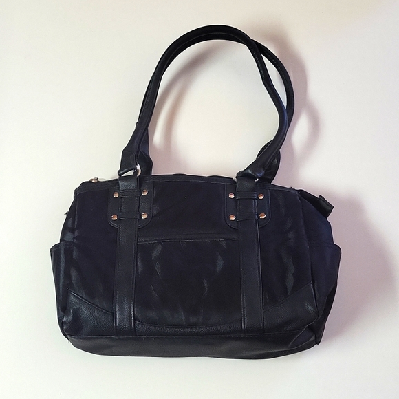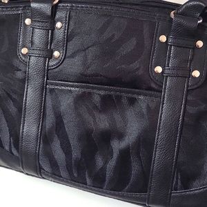 Black with subtle tiger stripe pattern. 3 zip pockets, one large and one small outer pocket, end pockets, inside zip and phone pockets give youlots of room for everything you might need! Measures 14" wide, 9" tall, 4" deep with 10" handles.