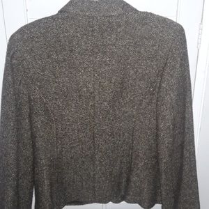 Brown tweed look. Waist length. Gently used and in good condition. Smoke and pet free home. 2 front small pockets with a swirl design made from material of the jacket. Jacket is super cute.