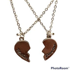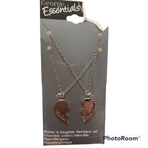 George Essentials Mother & Daughter necklace set. 2 necklaces with pendants. 1 pendant says mother, the other says daughter. Put them together, they make a heart. Necklaces are 16 inches with a 3 inch extender. Lobster clasp. Pendants are 1 inch tall. Hypo-allergenic.