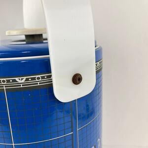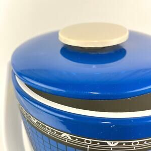 A beautiful blue vinyl with white plastic handle. It also has a white liner, and a blue and white lid. Would look great on a patio at the shore house or the yacht club.