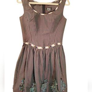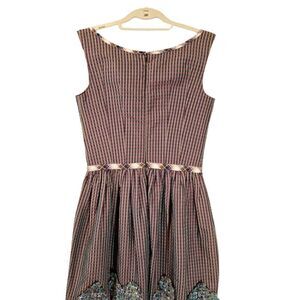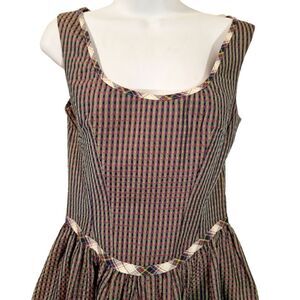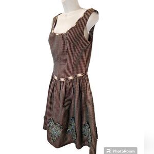 Beautiful avant-garde designer dress with fitted sleeveless bodice edged in plaid, fitted waist, and flared skirt. The skirt has the four suits from a deck of cards appliqued around the bottom. They look to be a tweed blend with distressed edges. Beautifully made, very unique dress. Fabric is a beautiful shimmery silk olive green , navy blue and maroon check with plaid edging and waistband. No size tag measures flat 16.5" pit to pit 14.5" waist 37" long