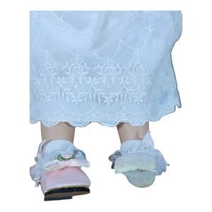 The doll is missing one of her shoes, but she does have her basket of flowers.