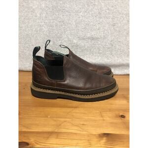 The Georgia Boots Brown Giant Romeo Men’s 10.5 M Low Top Slip On Work Shoes GR262 are a stylish and functional pair of boots designed for men. These slip-on Chelsea boots feature a round toe, pull-on closure, and ankle shaft style, making them easy to wear and comfortable for all-day use. The brown leather upper material, rubber outsole, and slip-resistant design make them suitable for various occasions, from casual outings to workwear. These boots are also waterproof and feature a solid pattern with logo accents, adding a touch of personality to your outfit. Georgia Boots are known for their quality and performance, making these shoes a reliable choice for any season.