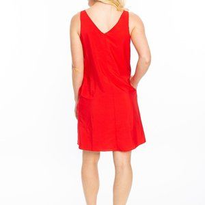 With a Bulldog print on one side and a solid red on the reverse, this dress let's you have two dresses in one. It's perfect for Georgia Bulldog Games. See bulldog print on inset of first picture. This reversible v-neck dress is machine washable, bra friendly and has pockets on both the inside and outside. Size Small. This dress is a classic fit. Go Dawgs!