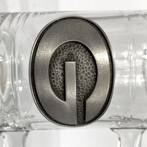 Elegant clear glass mug with a bold metallic emblem.