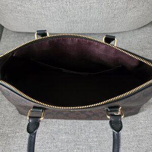 Signature coated canvas Inside multifunction pocket Zip-top closure fabric lining Handles with 4 1/4 drop Outside zip pocket Detachable strap with 22 drop for shoulder or crossbody wear 13 3/4 (L) x 7 3/4 (H) x 5 (W) Style No. CW422