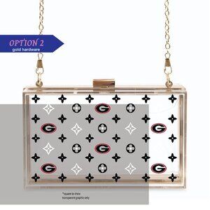 Stylish clear acrylic clutch with Georgia pattern graphic. Perfect for game day!