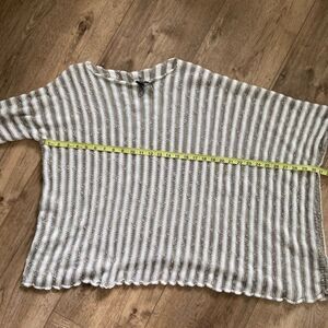 Gray and white striped cotton /linen blend asymmetrical arm lightweight sweater/pullover kinda has the vibe of off the shoulder without actually being off the shoulder , coastal gramma Or lagen look , measurements in photos for outline reference and size