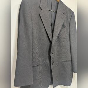 Armani Collezioni Suit Jacket in gray, size 44R, crafted from luxury wool, suitable for weddings and office events, is available in good condition. The jacket measures approximately 31.5 inches in length, with an arm length of about 15.5 inches from the armpit to the sleeve's end. The chest width is approximately 22 inches from armpit to armpit. This 100 percent wool jacket is in good condition, free from holes or stains.