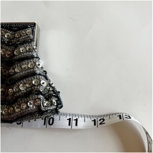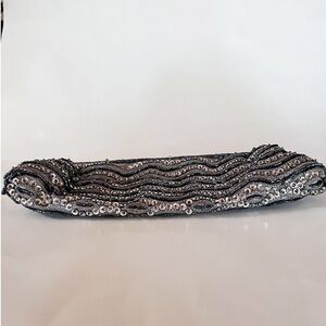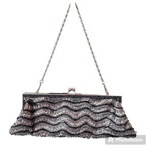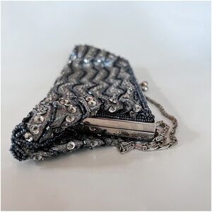 Georgiou Studio Vintage Sequin Silver Evening Clutch. Clasp top closure. Fabric lining. One interior slip pocket. Carry with chain strap or tuck into bag to use as clutch.