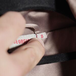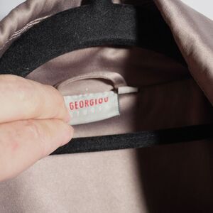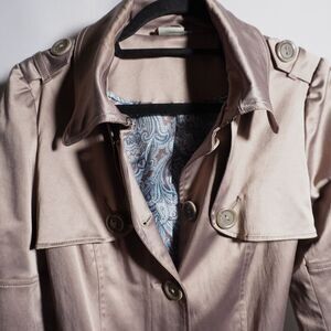 Georgiou Studio Tan Metallic Trench Coat Jacket Womens 8 Y2K Pockets Glam brown beige metal designer paisley lined pockets single breasted belted neutral modern minimalist
