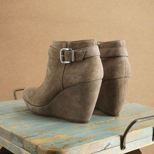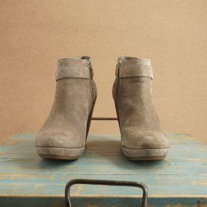 Elegant Geox ankle booties. Brown suede with sleek buckle. Features a comfortable wedge heel.