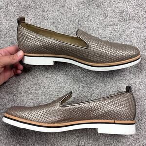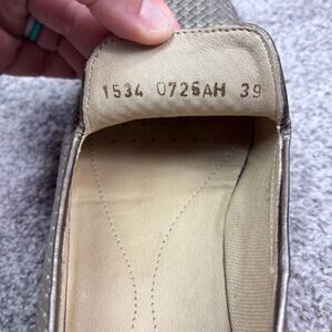 Really cool woven pattern on these gold tone loafers. Great rubber sole-extremely comfortable. Reads as a neutral. Preowned in great condition. Some minor signs of wear, but overall in outstanding shape. Smoke free home-quick shipper. High quality shoe.