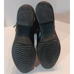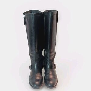 These are Geox Respira knee-high boots for women in black leather with an almond toe shape and a zipper closure. They have a 2" block heel and feature a vintage style. The boots are designed for comfort and breathability, suitable for travel, parties, work, and business occasions. Made in Italy with a standard shoe width, they are part of the amphibiox product line. Great pre-owned condition