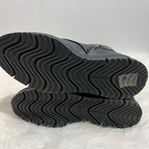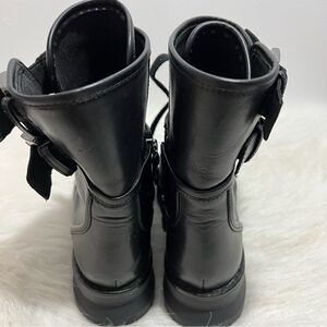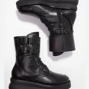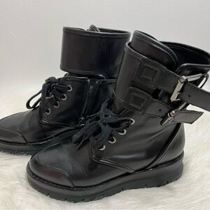 Italian Patent Leather black combat boots that features a two chrome metal buckle closure as well as lace up closure. Side zip for easy on/off. 1.5" platform