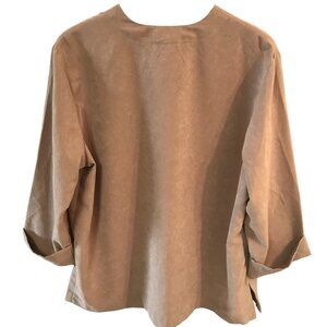 Vintage camel-colored blazer, size L. This lightweight tan embellished jacket in great condition from the 70s is decorated with tiny silver and gold rhinestones on the front for a sparkly look. It is button-down with 3-quarter cuffed sleeves and side slits. The soft fabric feels and looks like ultrasuede. Dress up a fall outfit with this comfortable blazer or wear on its own or layered over a tank or tee!