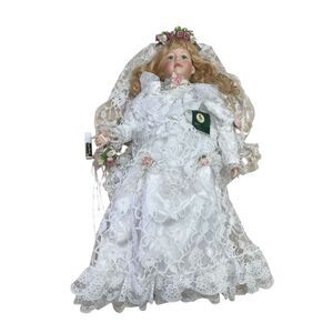 Geppettos brand porcelain doll, lacy and wedding themed, good condition , 18 inches , small blemish on face (pictured) good condition