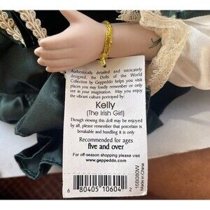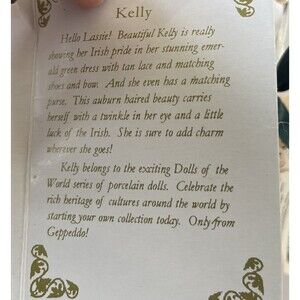 Dolls of the world by Geppeddo Kelly the Irish Girl doll. Great used condition with doll still attached to packaging. One small bow tie detached from shoe but still have bow tie. Thanks for looking!