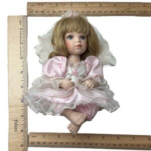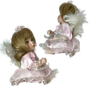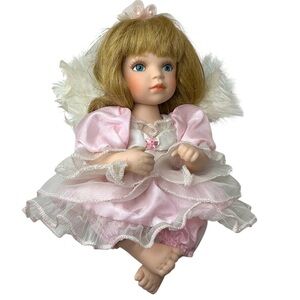 Porcelain Geppeddo Angel Doll Vintage 8” Delicate frilly Pink Ruffled Satin Lace Dress with Detachable Wings floral hair accessory Movable Body Parts Collectible Doll 8”