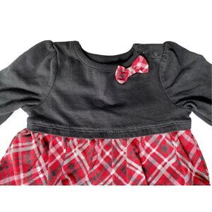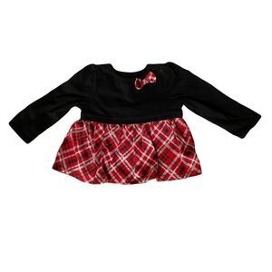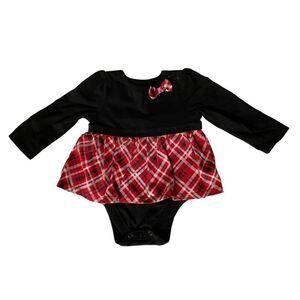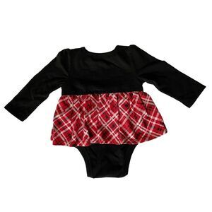 Baby Girl’s one-piece dress. Black cotton top and red, silver black plaid skirt. Comfy and dressy. Bow detail. 6-9m great condition. Cotton/polyester blend.