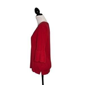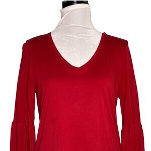 V-Neck Jersey Knit Top by Gerard Darel. EUC. No flaws or stains. This Gerard Darel V-Neck Jersey Knit Top in a rich red hue is a timeless wardrobe essential with a stylish twist. Crafted from soft, breathable jersey fabric, it features 3/4 length bell sleeves that add a touch of feminine flair. The flattering V-neckline and relaxed Size Medium fit make it perfect for layering or wearing on its own. Effortlessly chic, this top pairs beautifully with jeans, trousers, or skirts for a polished yet comfortable look.